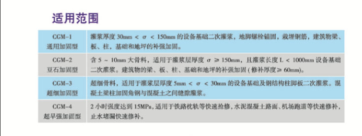 灌浆厚度30mm<δ<150mm设备基础二次灌浆,地脚螺栓锚固,栽埋钢筋,建筑物梁、板、柱、基础和地坪的补强加固。 |