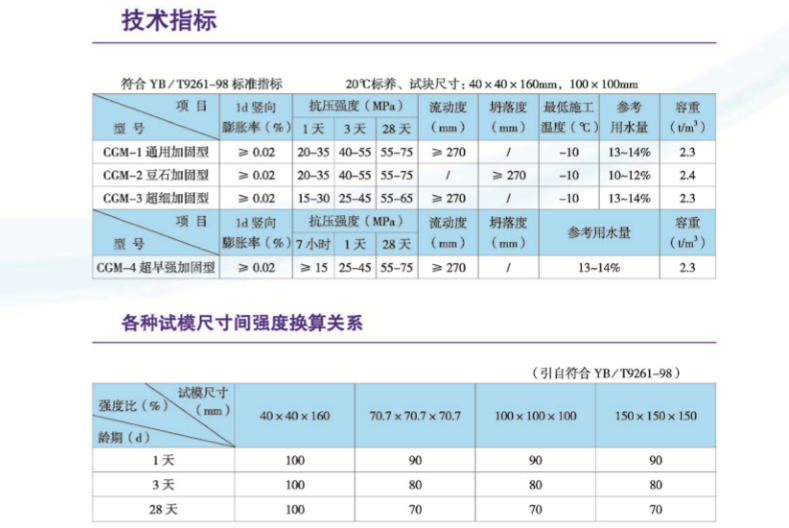 技术指标 符合YB/T9261-98标准指标 20℃标养、试块尺寸:40×40×160mm,100×100mm