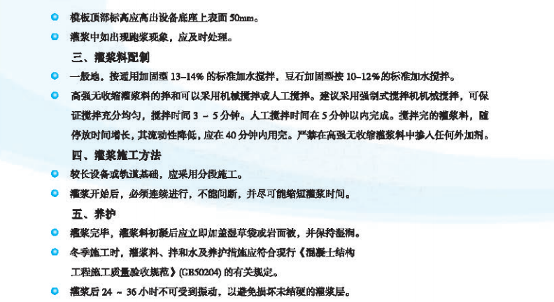 3、灌浆后24-36小时不可受到振动,以避免损坏未结硬的灌浆层。